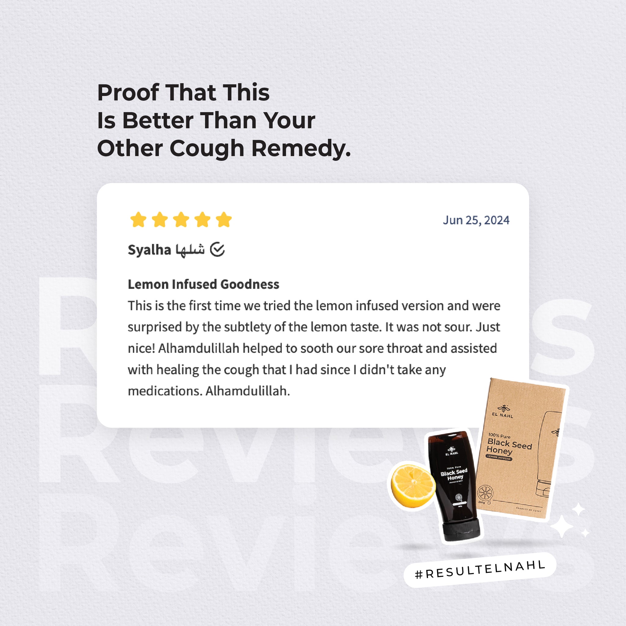 No more hassle of squeezing fresh lemon to warm water, add honey etc. Just need to add this to a cup of warm water and by the will of Allah, it soothes ur throat. Had to when i have dry cough also. It works alhamdulillah. Thank you for this, El Nahl!